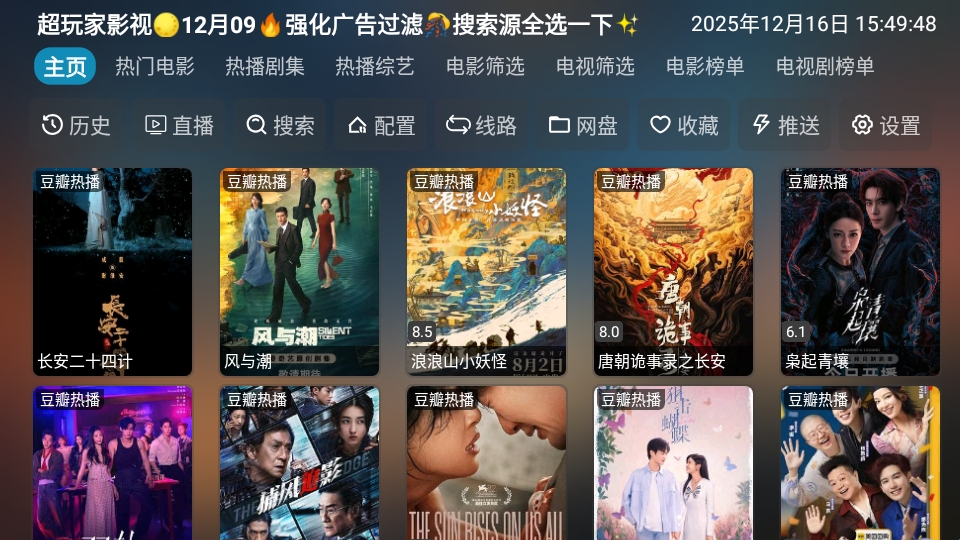 超玩家影视是一款专为追剧爱好者推出的免费电视盒子软件。这里有热门电影、热播剧集、热播综艺等类型,并且还经过了多重筛选,分类许多热度榜单,让用户每天都能观看喜欢的影视内容。此外软件还有超多数据源可供切换,像是投屏、直播、配置等基础功能都一应俱全,有兴趣的朋友们赶紧下载吧。