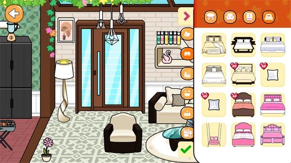 3、进入房间后点击右上角的按钮可以进入装饰界面,在这里你可以自由更换不同的家具物品。