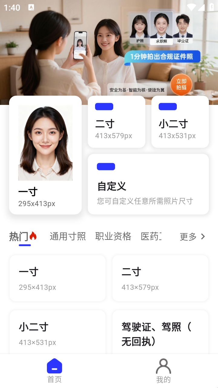 1.打开知拍App,首页提供了多种证件照规格,结合实际需求进行选择