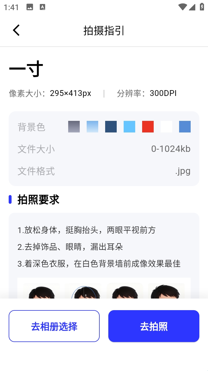 2.点击你所需规格进入查看拍摄指引,了解详情,选择背景,点击去拍照即可