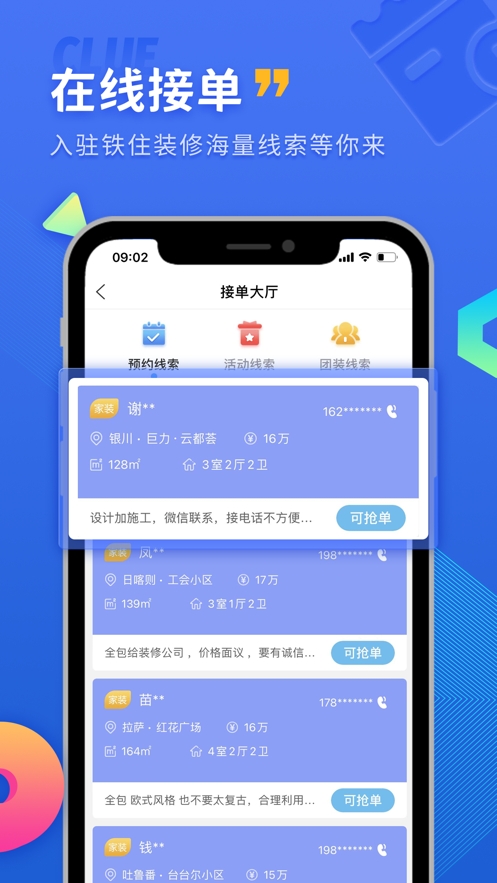 4,在线接单:用户可轻松接单,入驻平台获取海量线索。