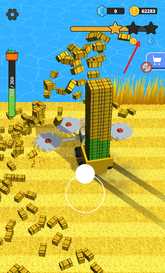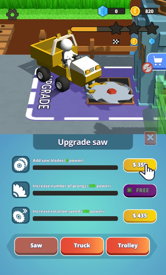 3、售卖草赚取金币后,需要即使升级收割机配件,可以添加锯片、增加锯齿数、提高旋转速度。