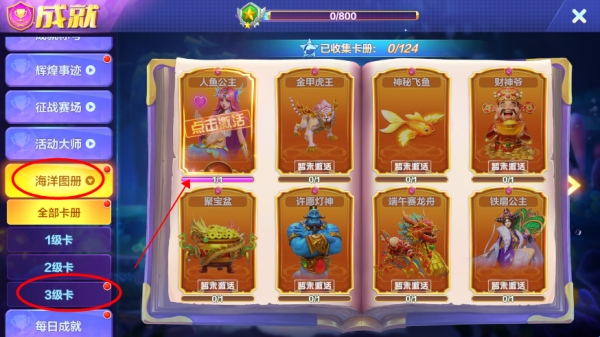 2、找到海洋图册中亮红点的卡册,即可看到可以解锁的卡册,如“人鱼公主”