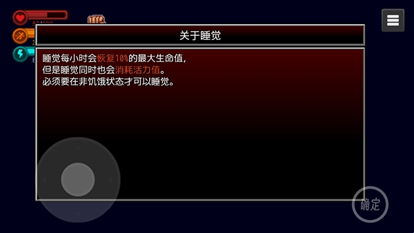 5、睡觉每小时会恢复10%的最大生命值,同时会消化活力值,需要在非饥饿状态才可以睡觉,