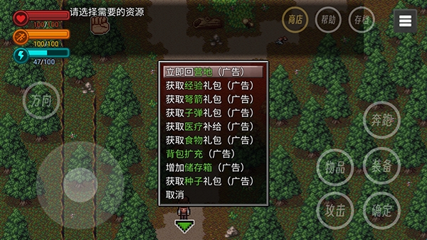 6、游戏中会有立即回营地、经验礼包、弩箭礼包、子弹礼包、医疗礼包、食物礼包等功能福利可以通过看广告进行获取,