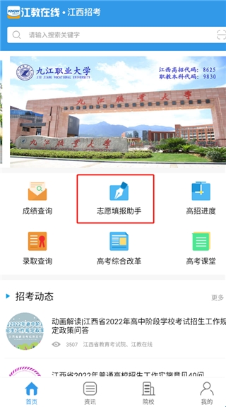 1、打开江教在线app,注册登录后进入首页,我们可以看到很多功能,如成绩查询、资源填报、录取查询等等,我们点击志愿填报助手;