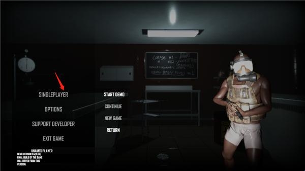 1、进入人渣scum正版,等待几秒进行游戏加载,然后正式进入游戏首页,点击单人游戏,里面提供了游戏演示、继续和新游戏,我们点击开始演示;