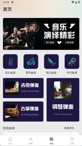 4、在弹奏页面中有弦乐曲谱、钢琴曲谱、管乐曲谱、声乐曲谱、吉他弹奏、古筝弹奏以及钢琴弹奏等功能。