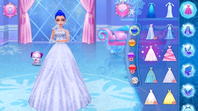 1、玩家将化身为冰雪世界里的美丽公主,在与王子共度良宵的城堡中一边跳舞,