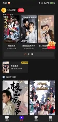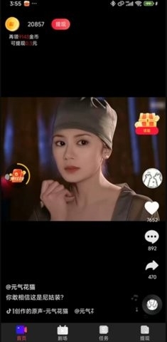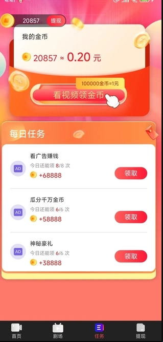 1、用户进入首页在线刷视频就可以赚金币,在视频界面有红包奖励。