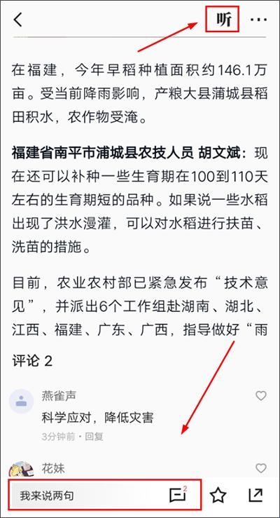 2、进入新闻页面,点击右上角【听】图标,即可收听该新闻。这对于想更了解新闻的朋友来说,这种方式更适合他们,因为不仅可以边看,边听新闻,还可以与其他用户在评论区探讨。
