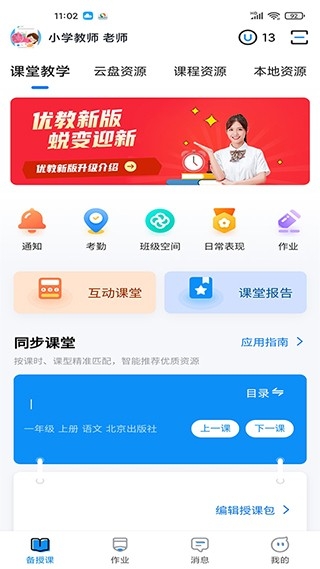 优教信使教师版是一款功能丰富的教学管理软件。软件内置通知、考勤、班级空间、日常表现、作业等板块,在这里用户能够轻松开启互动课堂、查看课堂报告,为班级的线上教学提供更多便利。此外软件还支持分享同步云盘、课程、本地等资源,有需要的朋友们欢迎在本站下载。