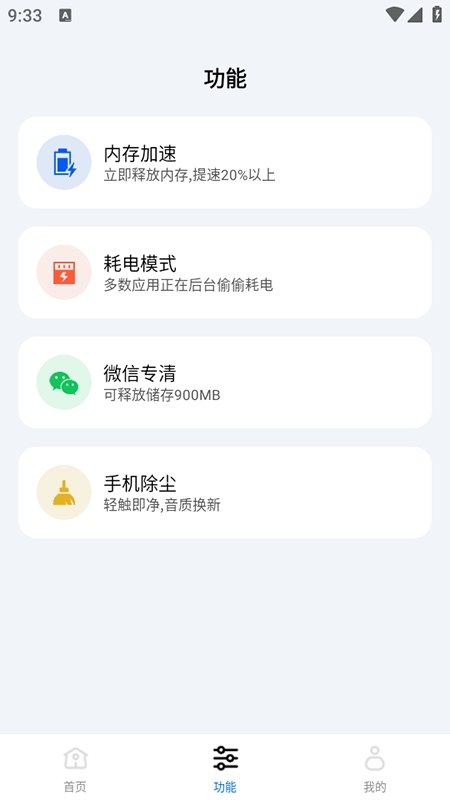 4、内存加速与清理:清理手机内存中的无用数据,释放被占用的内存资源,提升多任务处理速度;支持“微信专清”,专项清理微信聊天缓存、图片、视频等文件,节省存储空间。