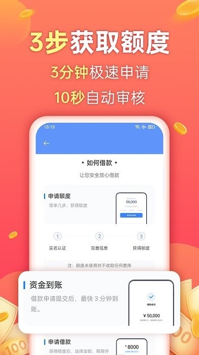 实名认证+完善信息+获取额度。获得额度后,选择金额、期限并绑定银行卡,即可完成借款申请。借款申请提交后,最快3分钟到胀。