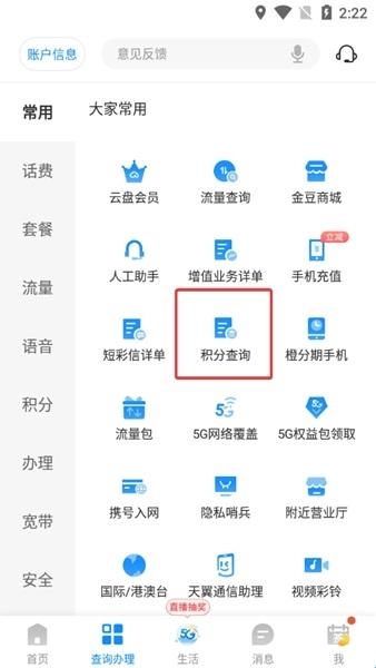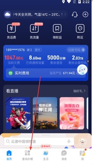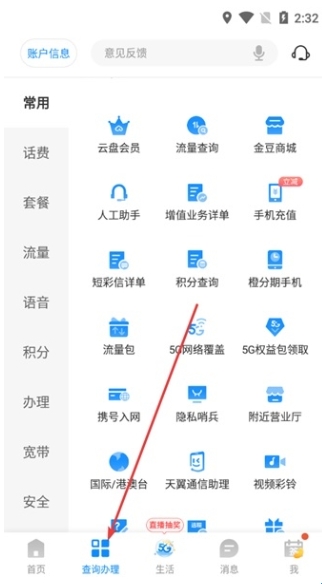 2、进入电信营业厅软件,默认进入首页,点击下方“查询办理”。