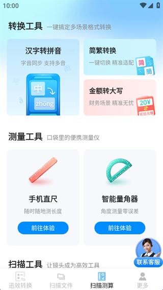 迅效转换测扫管家是一款特别好用的综合性工具箱软件。软件涵盖汉字转拼音、简繁转换、金额转大写等转换工具,并且内置手机直尺、智能量角器等测量工具,所有功能一键即可点击使用。此外软件的界面简约明了,工具经过整合分类,帮助用户快速找到所需功能。感兴趣的朋友们赶快下载吧。