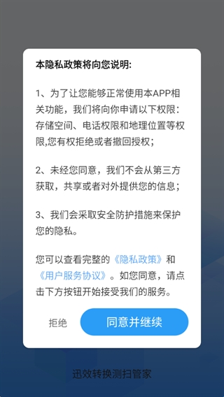 1、阅读隐私政策和用户服务协议之后点击同意并继续;