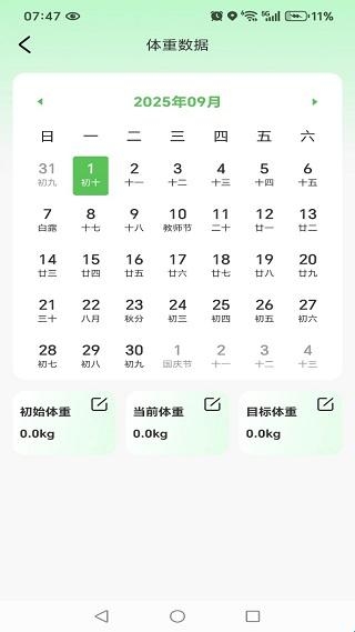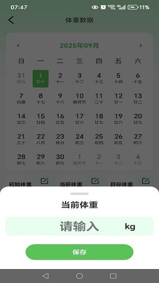 2、点击进入记录页面,可以按照日历,添加你每一日体重数据。