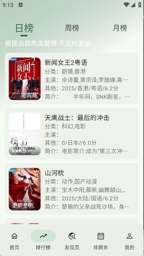 HG影视是一款支持无广告追剧的免费影视软件。软件内置电影、电视剧、动漫、综艺、短剧等多种影视内容,排期表、日榜、周榜、月榜等均会持续更新。软件不仅支持投屏操作,而且还有多种播放源可供更换,像收藏、分享、下载等基础功能也一应俱全,非常适合广大追剧爱好者使用,喜欢的朋友们赶快下载吧。