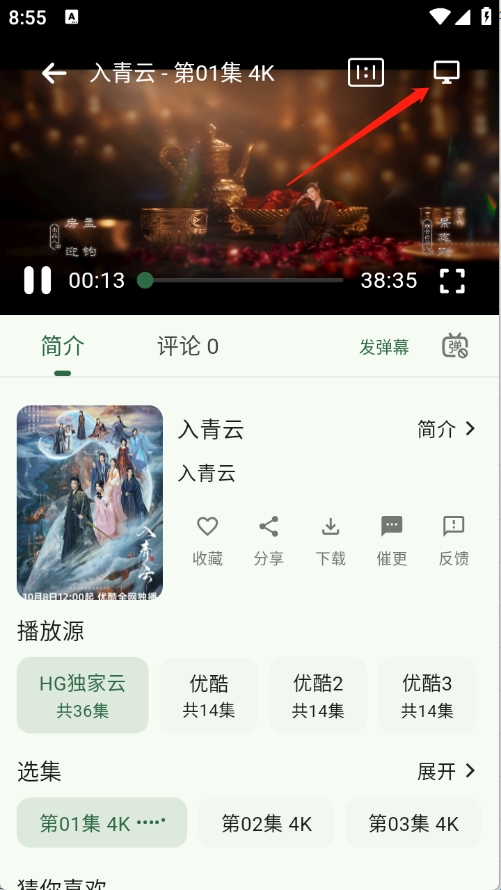 1、用户点开想看的影视进入到详情页,点击右上角的投屏。