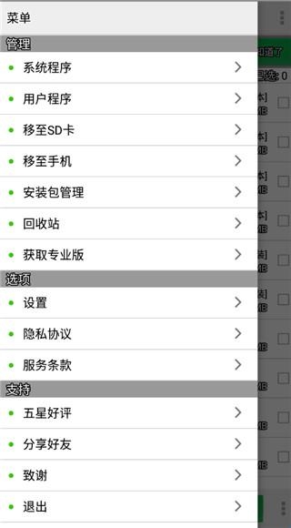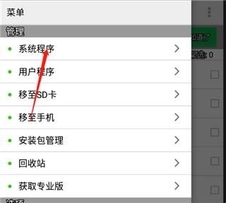 1、打开在本站下载的系统程序安全卸载器,进入首页点击左上角的菜单管理,我们可以看到有很多的功能,如系统程序、用户程序、回收站、设置、安装包管理等等功能