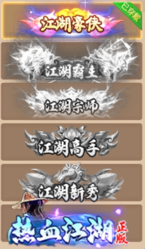 特殊称号:这些称号拥有更强的象征意义,代表着玩家在武林中的绝世地位。常见的特殊称号有:侠义之士、天下无敌、武林圣手、罕逢敌手、武林前辈、一骑绝尘、傲视群雄、遥遥领先、练级狂人、神功盖世、武学大成、臻至化境、炉火纯青、愿得一人心、比翼双飞、首充达人、江湖豪侠、江湖霸主、江湖宗师、江湖高手、新晋新秀等。
