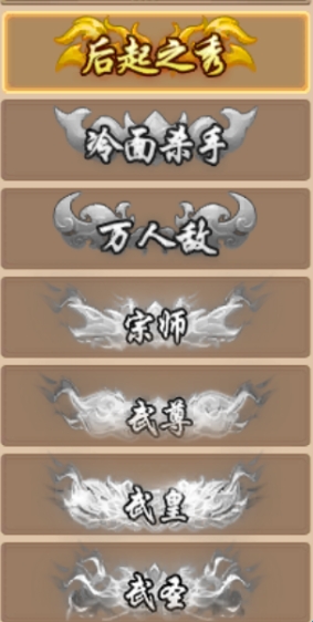 武勋称号:这些称号专门为勇猛的战士设立,代表着玩家在战斗中的非凡表现。常见的武勋称号包括:新秀崛起、冷面刺客、万人敌、宗师、武尊、武皇、武圣等。