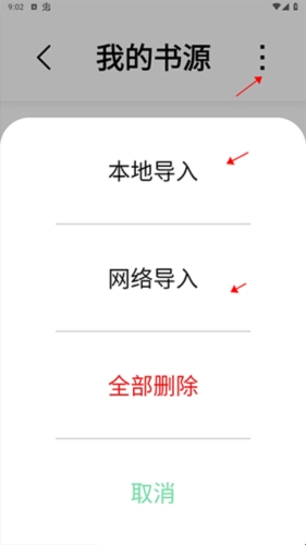 2、然后系统会自带部分的书源,如果觉得这些不够的话可以点击右上角,里面支持本地导入和网络导入