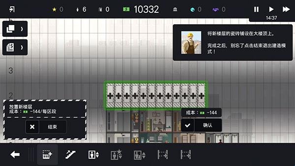 7、按住屏幕向右滑动,选择放置的区域,为摩天大楼新建楼层吧!