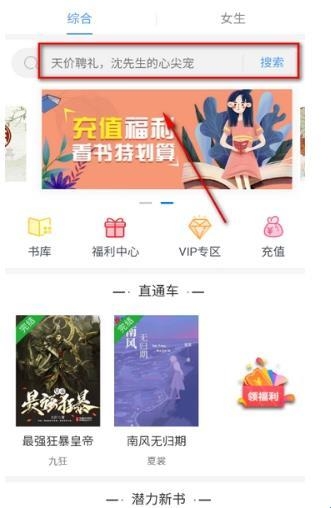 2、用户根据不同的页面,找到并点击搜索按钮后,输入小说的名称