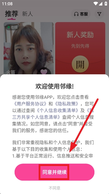 1、下载安装并打开邻缘,在欢迎使用邻缘!提示界面点击同意并继续