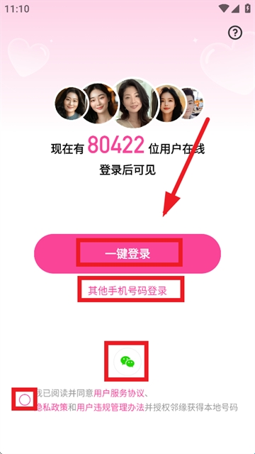 2、勾选我已阅读并同意用户服务协议隐私政策和用户违规管理办法并授权邻缘获得本地号码,从一键登录,其他手机号码登录,微信授权登录选择其一登录即可
