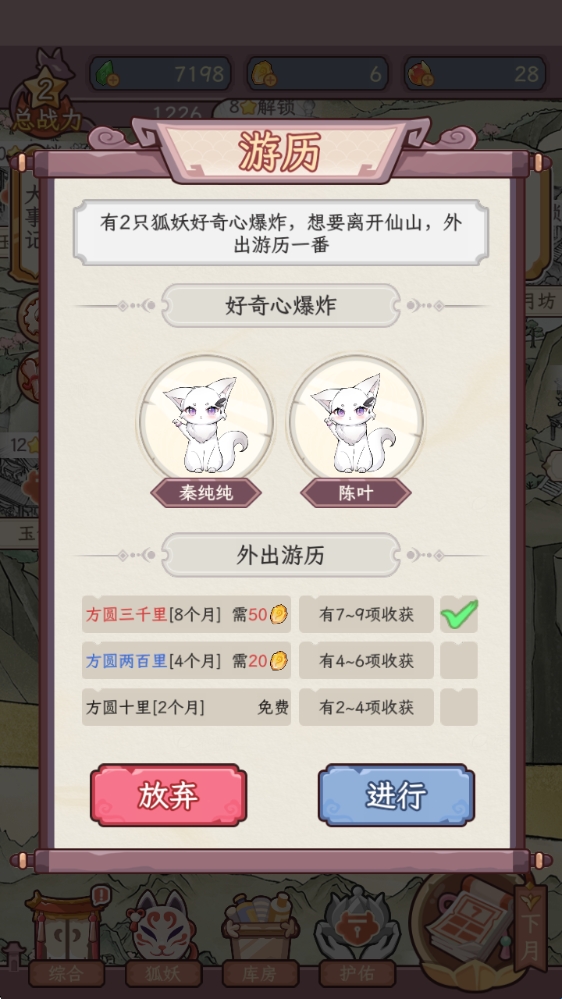 1、游戏分为了上侧的仙山和下侧的人间,通过人间的青丘我们可以收留各种狐狸。