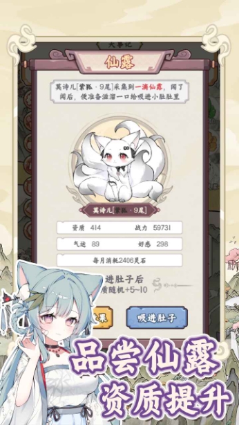 1、通过培育可爱的小狐仙们来升级,解锁更多修炼的场景,例如化形峰助狐妖们升级成为美人!