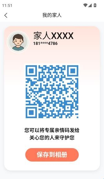 6、这样就可以看到自己的亲情码,点击“保存到相册”按钮来实时保存分享。