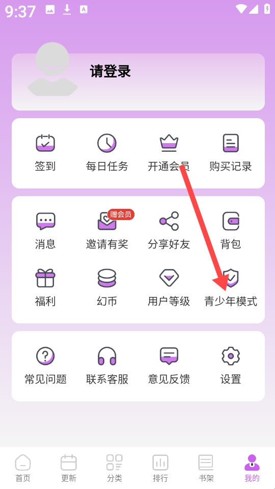 4、进入“我的”页面,点击右下角个人中心区域,即可开启青少年保护模式,营造更健康的阅读环境。