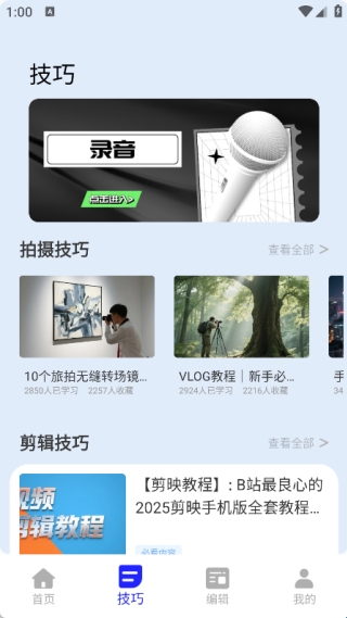 3、在技巧页面,可以学习拍摄和视频剪辑的相关技巧。
