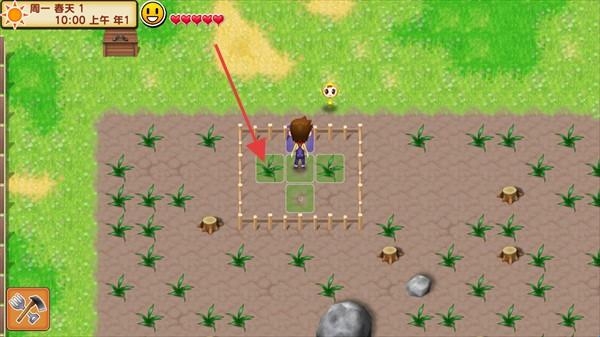 3、操控角色移动到农田区域,查看围栏内的作物种植区,准备进行开垦、种植等牧场经营操作。