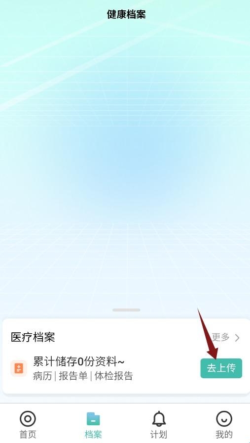 3、档案界面点击“去上传”按钮,即可提交个人医疗档案。