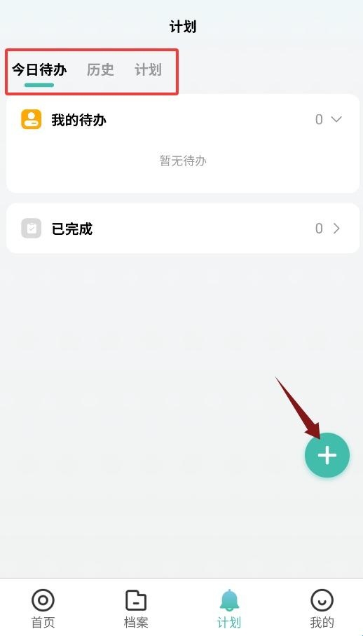 4、计划界面分为今日待办、历史记录与未来计划三个板块。