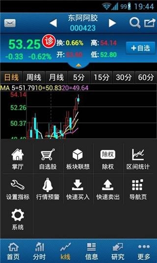 3、点击交易,即可查看普通股票,K线,也可以进行买入、卖出等操作