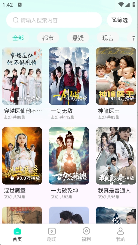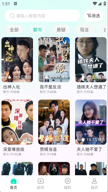2、首页可以看到很多的短剧资源类型,都市、悬疑以及现言等类型。