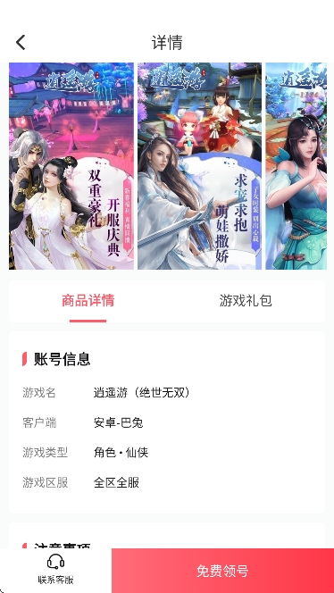 5、进入到具体的一款游戏中,能看到关于该账号商品的详情介绍和游戏礼包。