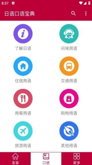 2、点击口语,是可以去了解日语,问候用语,住宿用语提供。