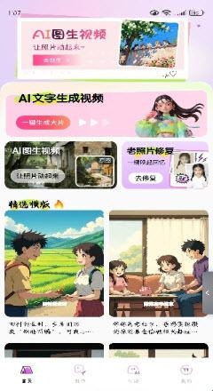 图文AI一键成片是一款功能多样的智能视频创作软件。软件首页有着海量的精选模板,用户可以一键免费套用,同时AI图生视频、老照片修复等实用功能也清晰显示,解决用户大部分的问题。软件操作简单,导入照片后再进行对应描述即可,软件会不断的进行优化直到达到要求。有需要的朋友们快来下载吧。