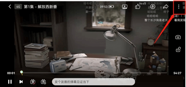 1、首先在哔哩哔哩观看视频切换横屏后,点击右上角三点。