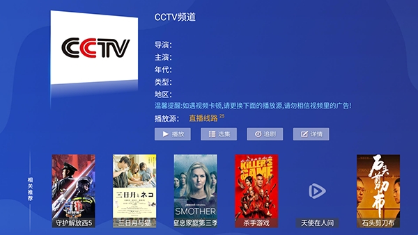 3、等待软件加载播放,电视端用户直接使用遥控器上下换台即可。
