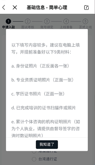 5、根据页面请用户填写个人的基础信息和准备资料和材料。资料需证明以下资质或胜任力: