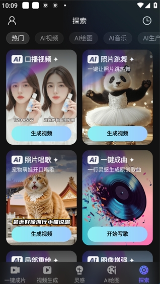 1、探索板块包含:AI口播视频、照片跳舞、照片唱歌等特色功能,支持一键生成对应内容。