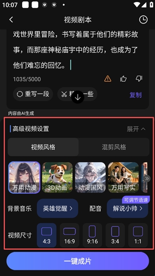 提供视频风格(如万用动漫、3D动画)、背景音乐、配音、视频尺寸等自定义选项,设置后可点击 “一键成片”生成故事。